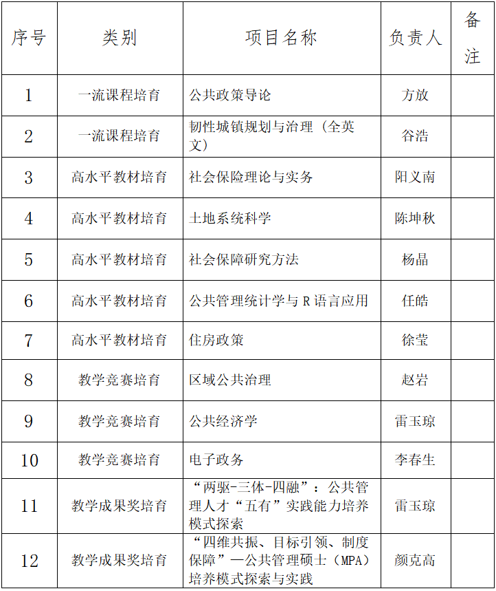 根据《关于申报湖南大学公共管理学院2025年教学培育项目的通知》,经教师申请、学院教学委员会评审、学院党政联席会议审批,现将拟认定湖南大学公共管理学院2025年教学培育项目名单公示如下: