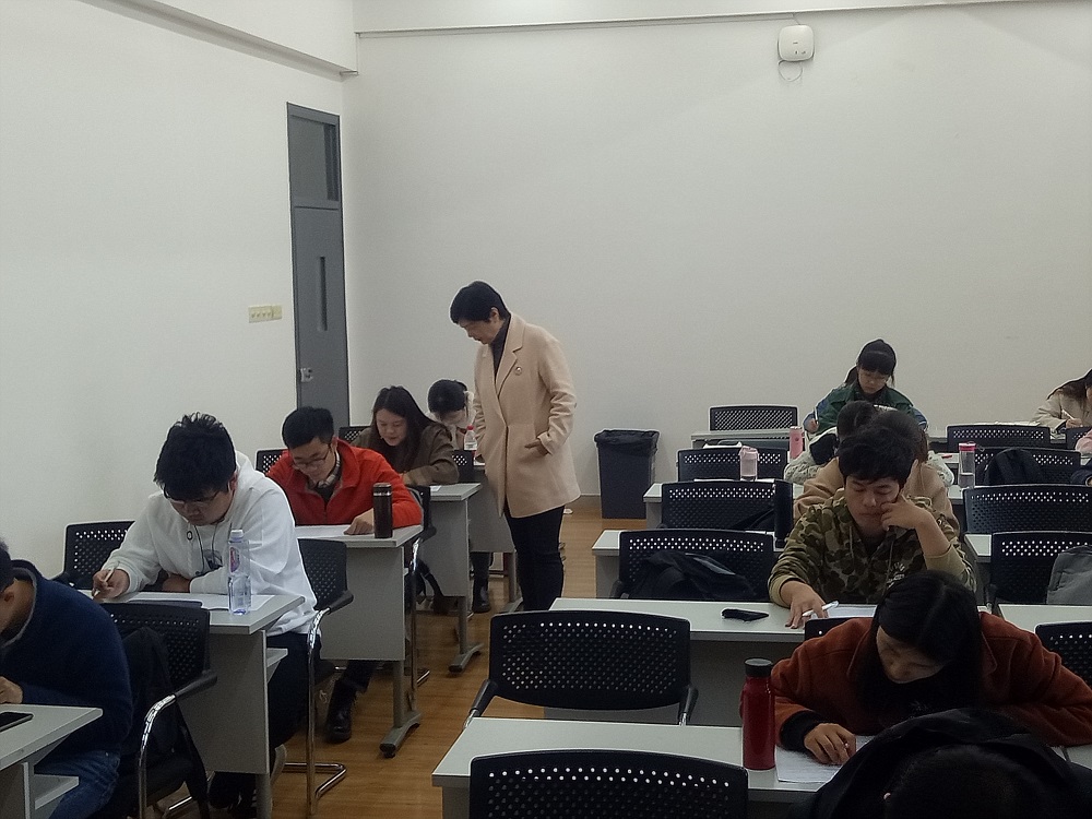本次考试题型分为单选、判断、填空、简答四部分,院党委书记付蓉芬担任巡考员,监考工作由党务与人才培养工作办公室主任杨锦滔和学生辅导员王浩负责。共91名学生参加考试。
