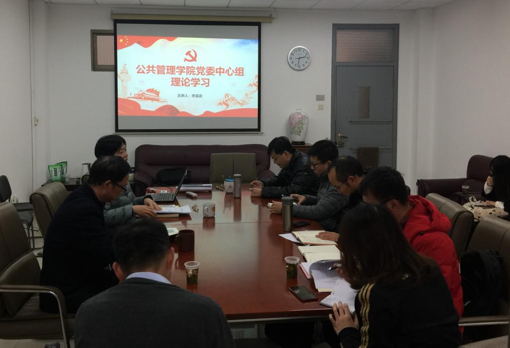 11月26日下午,公共管理学院召开党委理论学习中心组(扩大)学习会议,专题学习贯彻党的十九届四中全会精神。学院党委书记付蓉芬主持,院长李连友领学,学院领导、各党支部书记参加。