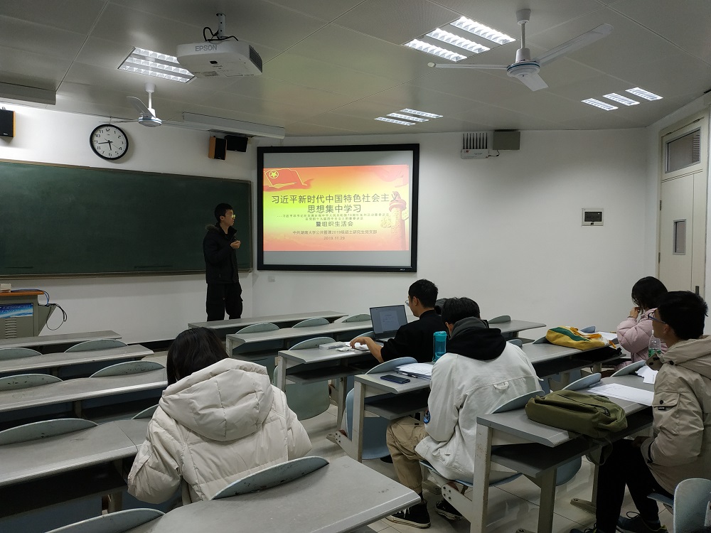 2019年11月29日下午,公共管理学院2019级硕士研究生党支部在财院校区水上教学楼610教室,召开习近平新时代中国特色社会主义思想集中学习座谈会。会议由支部书记郑朝阳主持,学院党务与人才培养办公室主任兼研究生辅导员杨锦滔老师出席会议,支部全体党员共同参与讨论学习。