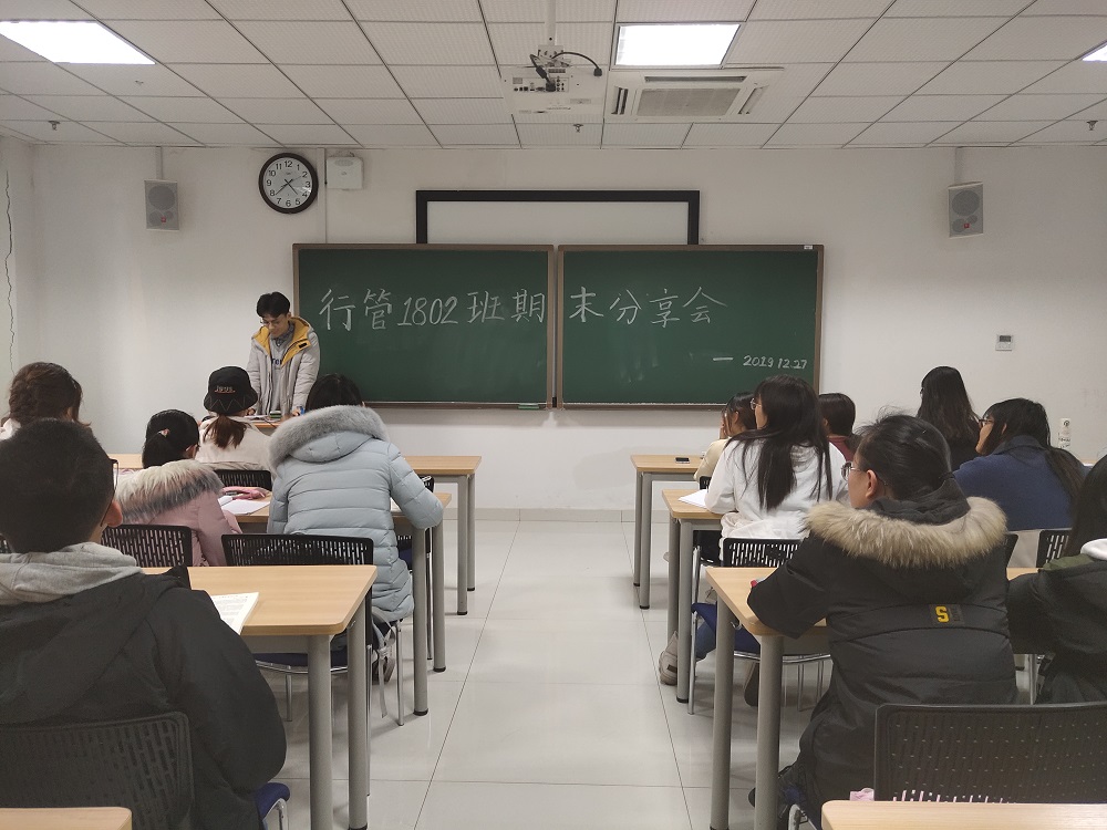 为帮助同学们进行期末总结复习,提高班级学习成绩,降低班级挂科率,促进优秀班级建设,12月27日下午,行政管理1802班在研究生院楼开展期末学习经验分享交流会。本次活动由腊炳辉主持,邀请2017级学长学姐石一琨、颜亚丽、胡鑫雅参与,行管1802班全体参加。