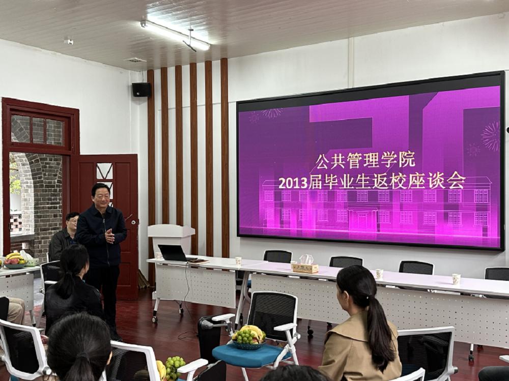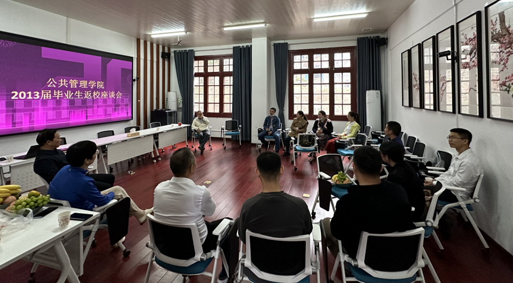 2023年10月5日,2013届毕业生校友返校座谈会在公共管理学院院楼221举办,湖南大学公共管理学院院长李连友、党委书记宋杰、正处级组织员付蓉芬、党委副书记、纪委书记杜倩博、湖南大学校友总会公共管理学院分会会长李金龙教授和2013届校友近20人出席本次座谈会。