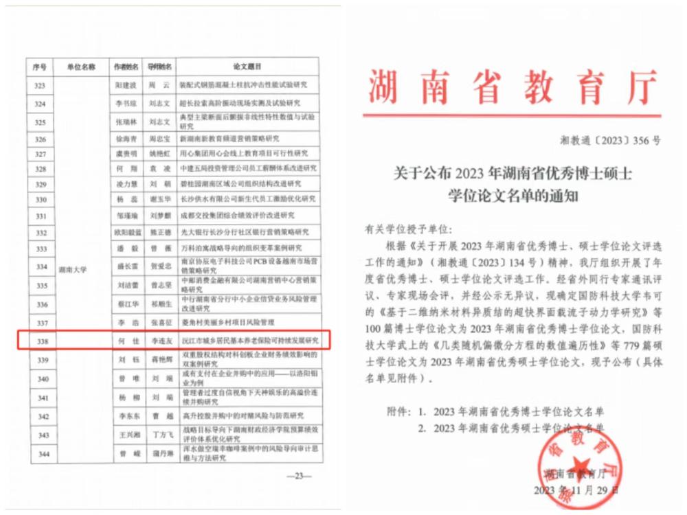 在湖南大学入选2023年湖南省优秀专业学位硕士论文的72篇名单中,我院2021届MPA毕业生——何佳撰写的题为《沅江市城乡居民基本养老保险可持续发展研究》毕业论文获此殊荣。