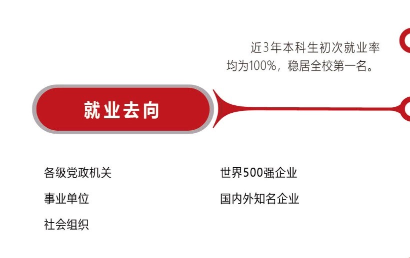 近3年本科生初次就业率均为100%,稳居全校第一名,多在各级党政机关、事业单位、社会组织、世界500强企业以及国内外知名企业工作。近3年学院本科生升学率保持在30%左右,大部分升学去向为中国人民大学、上海交通大学、西安交通大学、南京大学、中山大学等国内“双一流”建设高校,以及美国得克萨斯大学奥斯汀分校、英国曼彻斯特大学、英国伦敦国王学院、英国伦敦大学学院、香港中文大学等国(境)外知名高校。