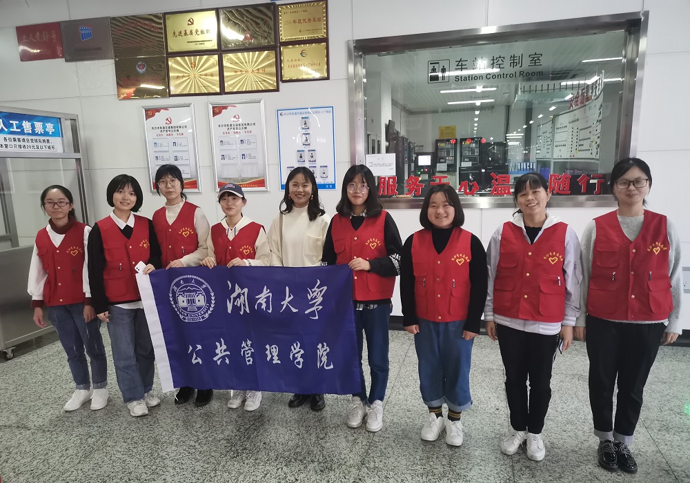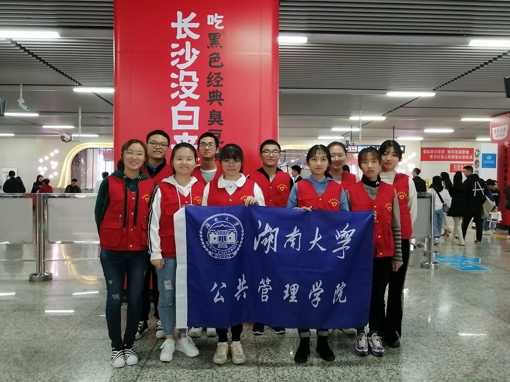 10月26日、27日,湖南大学公共管理学院与土木工程学院的志愿者服务团来到长沙五一广场地铁站开展以“美丽长沙 文明地铁”为主题的志愿活动。在为期两天的志愿服务活动中,来自两个院的数名志愿者在TVM引导岗、屏蔽门引导岗、闸机引导岗等为乘客提供引导和咨询服务。