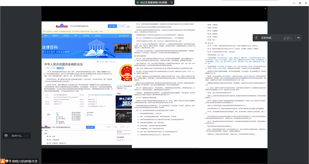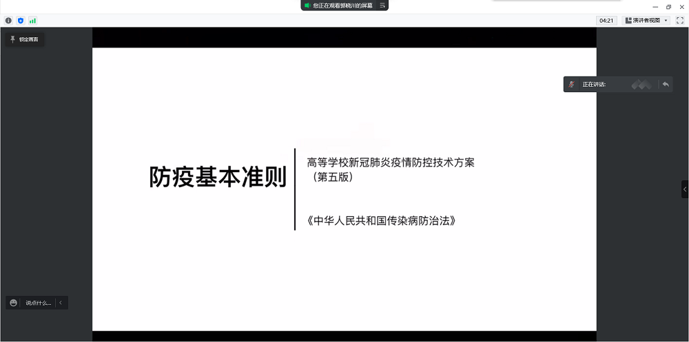 为帮助同学们充分了解新冠肺炎疫情传播特点和防控政策,深化对目前疫情防控形势的认识,切实提高我院同学疫情防控能力和水平,4月21日下午4:00,公共管理学院2021级组织开展了新冠肺炎疫情防控线上培训,此次会议由年级长郭晓川同学主持,公共管理学院行政管理专业2021级全体成员参会。培训主题为法律法规与行为准则,会议聚焦于学习与解读以下三份疫情防控政策文件:《中华人民共和国传染病防治法》、高等学校新冠肺炎疫情防控技术方案(第五版)。