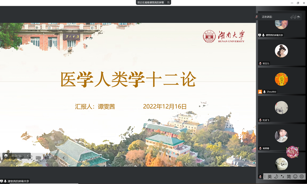 2022年12月16日晚,公共管理学院公共健康与社会保障研究所第14期“品读经典”读书会在线上举行。本次读书会分享的经典书目:《医学人类学十二论》(作者:朱剑峰)。本期读书会由周蔚老师主持,硕士生谭雯茜、程美裕、胡晓蕙、杜孟飞先后进行学习分享,研究所十余名研究生参加。