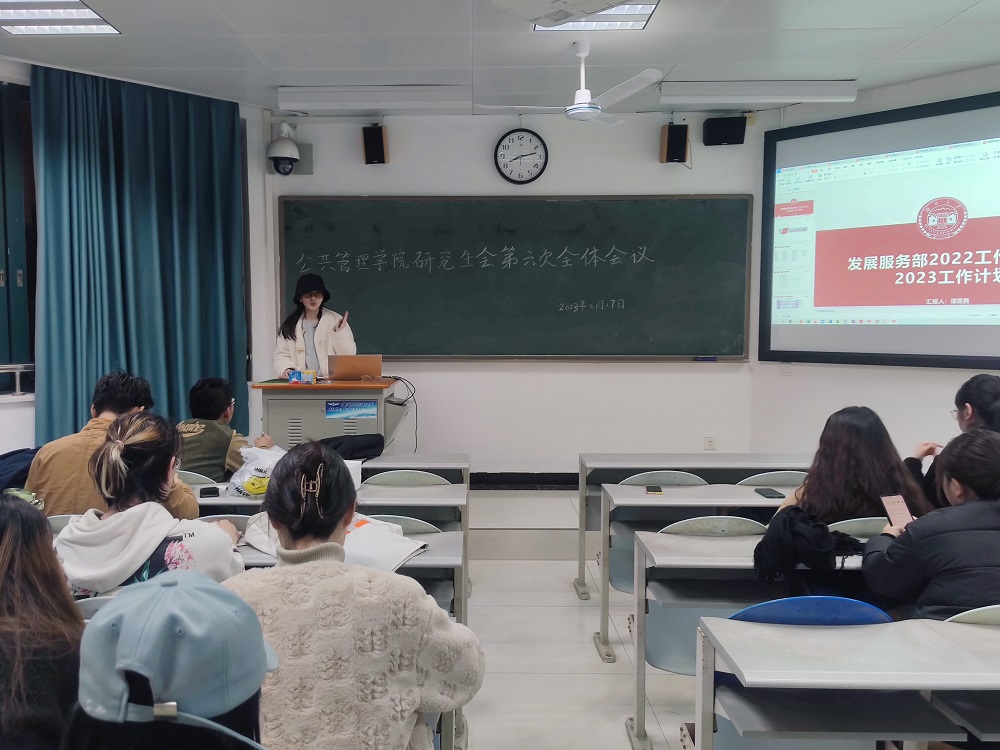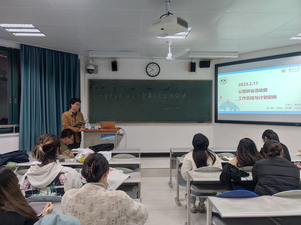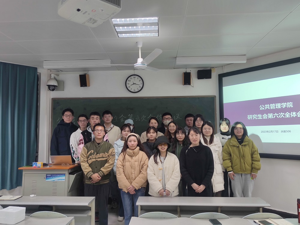 2023年2月17日晚,公共管理学院研究生会第六次全体会议在财院校区水上教学楼506教室召开,会议由研究生会执行主席徐一峰主持,研会全体成员参会。