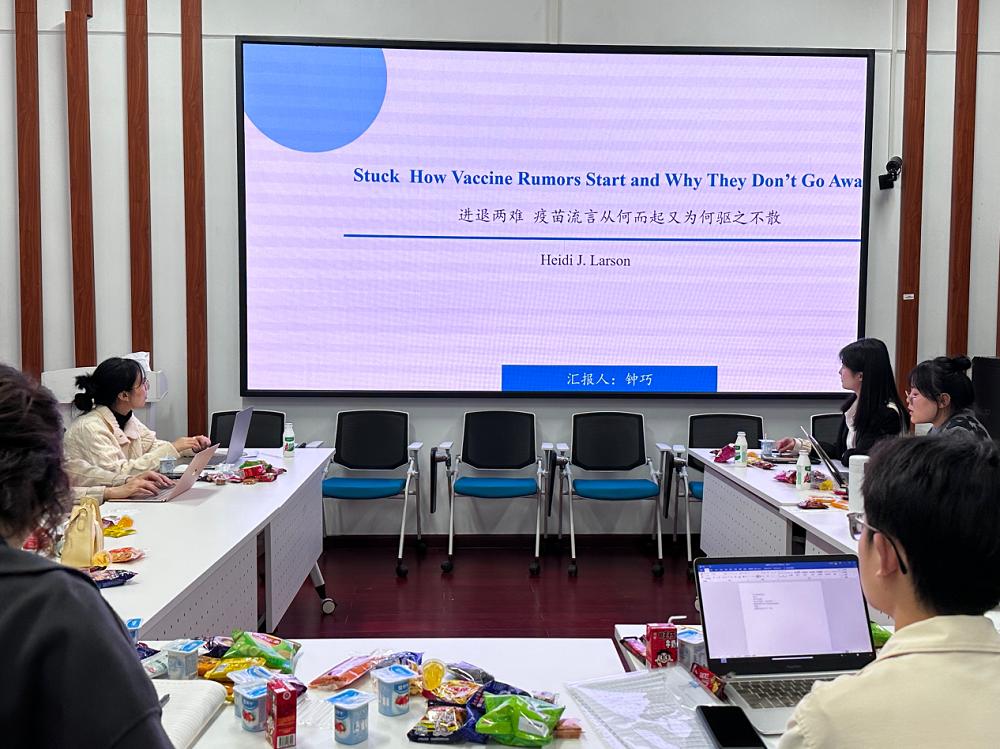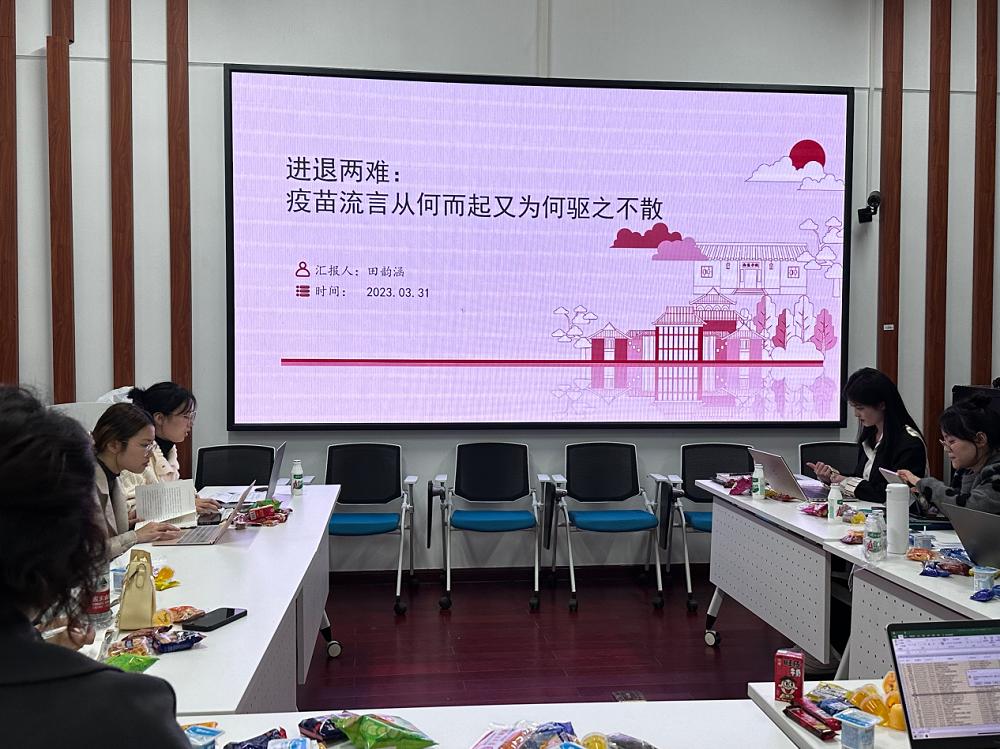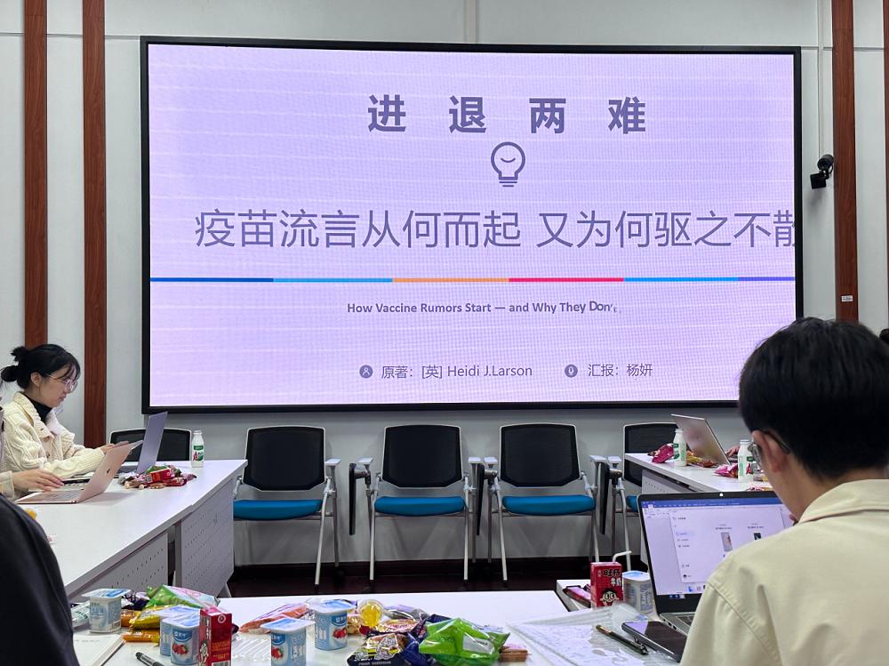 2023年4月5日晚,我院公共健康与社会保障研究所第15期“品读经典” 读书会在院楼221会议室成功举行。本次读书会分享的经典书目:《进退两难 疫苗流言从何而起又为何驱之不散》,作者:(英)海蒂·J.拉森 著,高峥荣,崔樱子译。我院王楠副教授主持领读,硕士生田韵涵、张吉儿、杨妍、钟巧先后进行学习分享,研究所共计10余名硕士、博士参加了本次读书会。