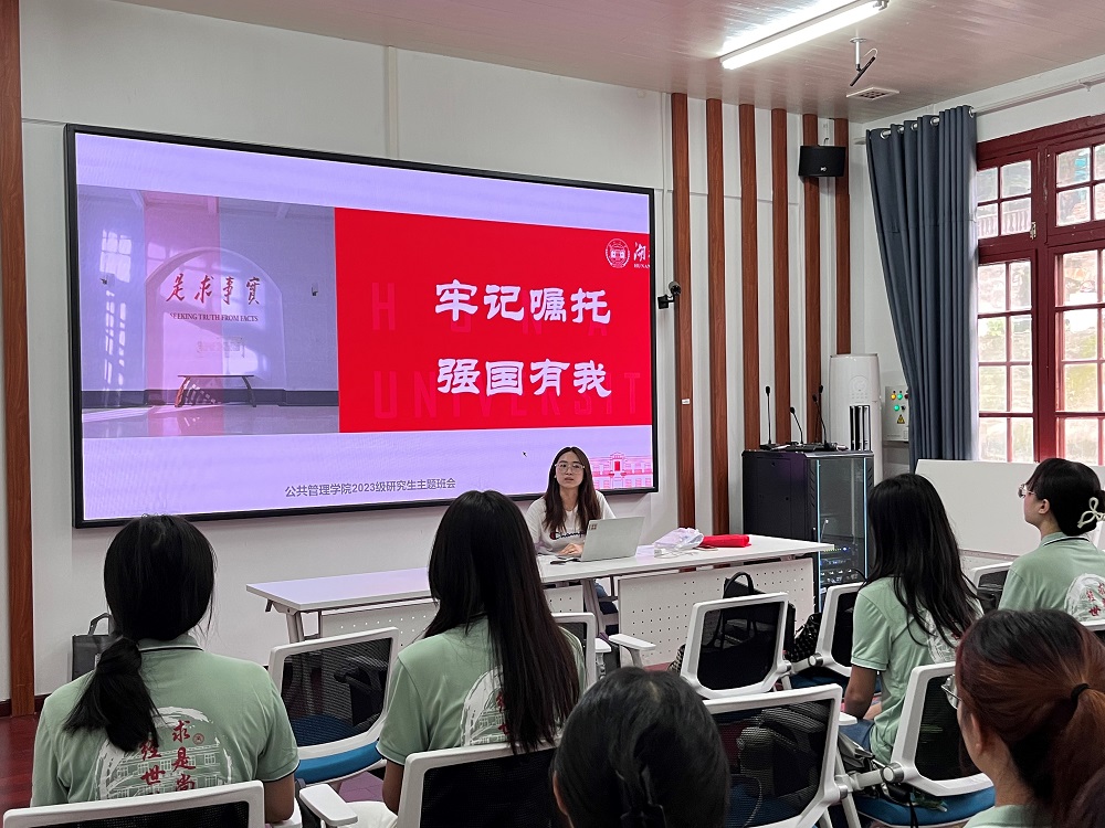 9月14日上午,公共管理学院2023级研究生新生入学教育之“牢记嘱托 强国有我”主题班会在公共管理学院院楼221教室举行。本次主题班会由公共管理学院2023级研究生助理辅导员林子如主持,2023级研究生参加,本次主题班会旨在引导学生明校史校情,承接总书记嘱托,牢记使命,不忘初心。