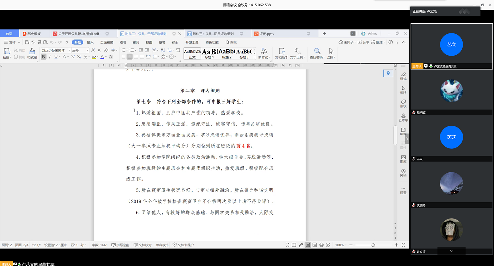 4月11日下午,行政管理1802班团支部采用线上会议的形式开展2019-2020年度个人荣誉评选大会。本次会议由组宣委员卢艺文主持,行政管理1802班全体同学参加。