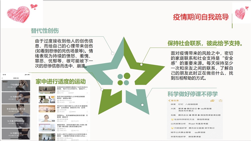 陈欣带领全班同学进行疫情知识大学习,全班同学一同参与疫情知识小测验,在巩固巩固防疫知识的同时理性面对、科学防护。陈欣着重介绍了疫情期间的自我疏导方法,倡导大家在家中进行适当的运动,保持社会联系,维持身心健康。